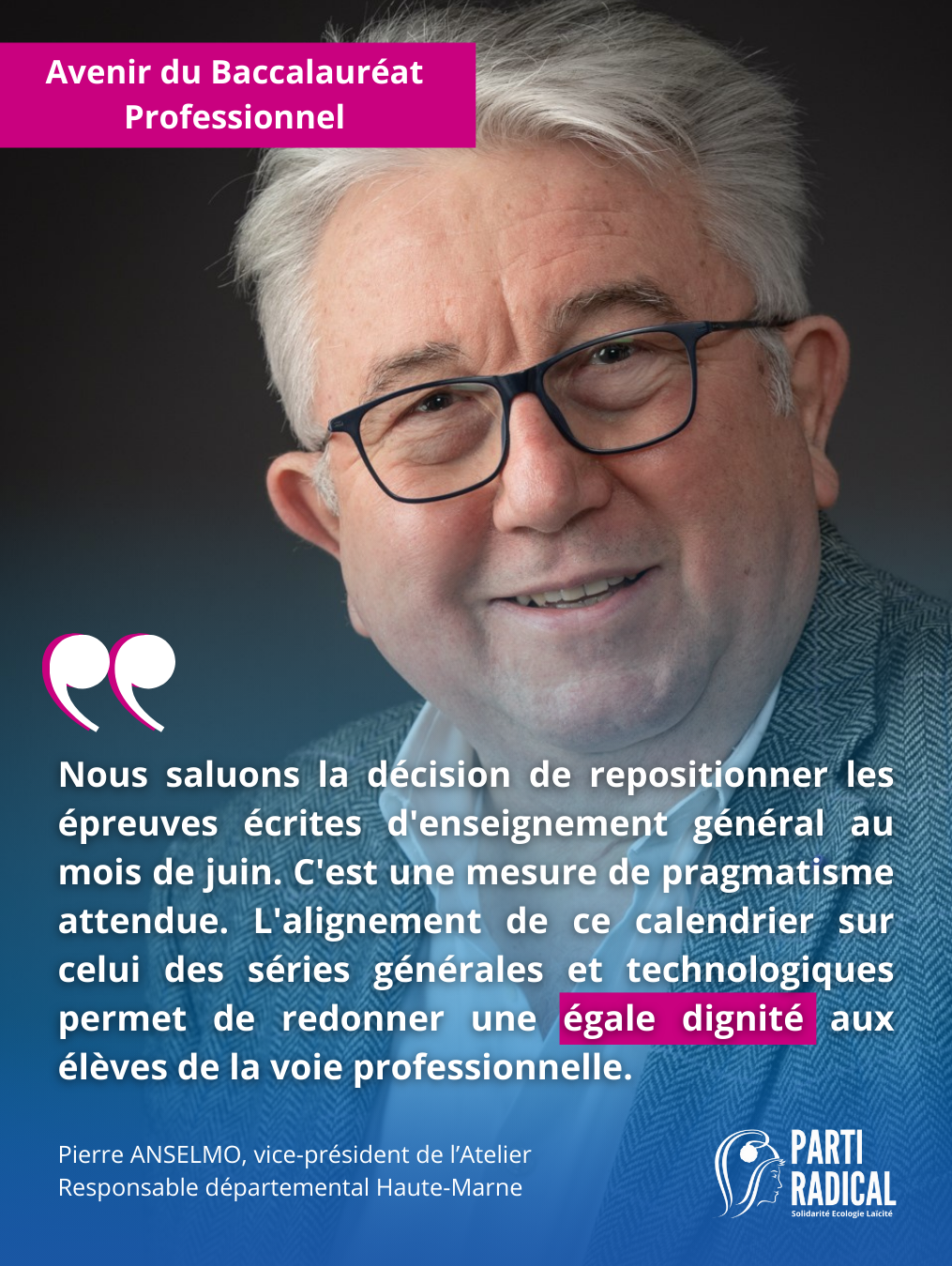 « Nous saluons notamment la décision de repositionner les épreuves écrites d’enseignement général au mois de juin. C’est une mesure de pragmatisme attendue. L’alignement de ce calendrier sur celui des séries générales et technologiques permet de redonner une égale dignité aux élèves de la voie professionnelle » précise Pierre ANSELMO, vice-président de l’Atelier, laboratoire d’idées du Parti Radical. La sanctuarisation du temps scolaire jusqu’à la fin de l’année luttera efficacement contre le décrochage printanier et rendra toute sa valeur au diplôme.
