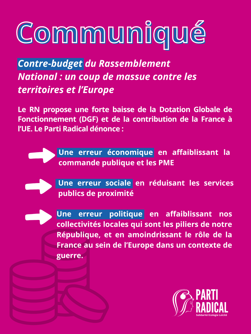 « Ce n’est pas en affaiblissant financièrement nos collectivités que nous améliorerons la situation économique de notre pays. Nous devons au contraire nous appuyer davantage sur nos territoires et appelons à une nécessaire autonomie fiscale et budgétaire pour nos collectivités afin de les protéger du désengagement de l’Etat », conclut Nathalie DELATTRE, Présidente du Parti Radical.