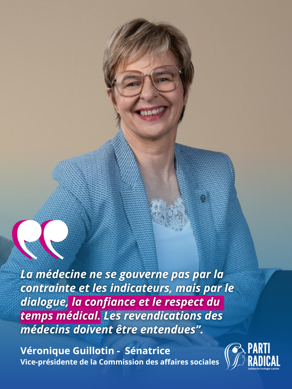 « La médecine ne se gouverne pas par la contrainte et les indicateurs, mais par le dialogue, la confiance et le respect du temps médical » précise Véronique Guillotin, Sénatrice de Meurthe-et-Moselle, vice-présidente de la commission des Affaires sociales du Sénat.