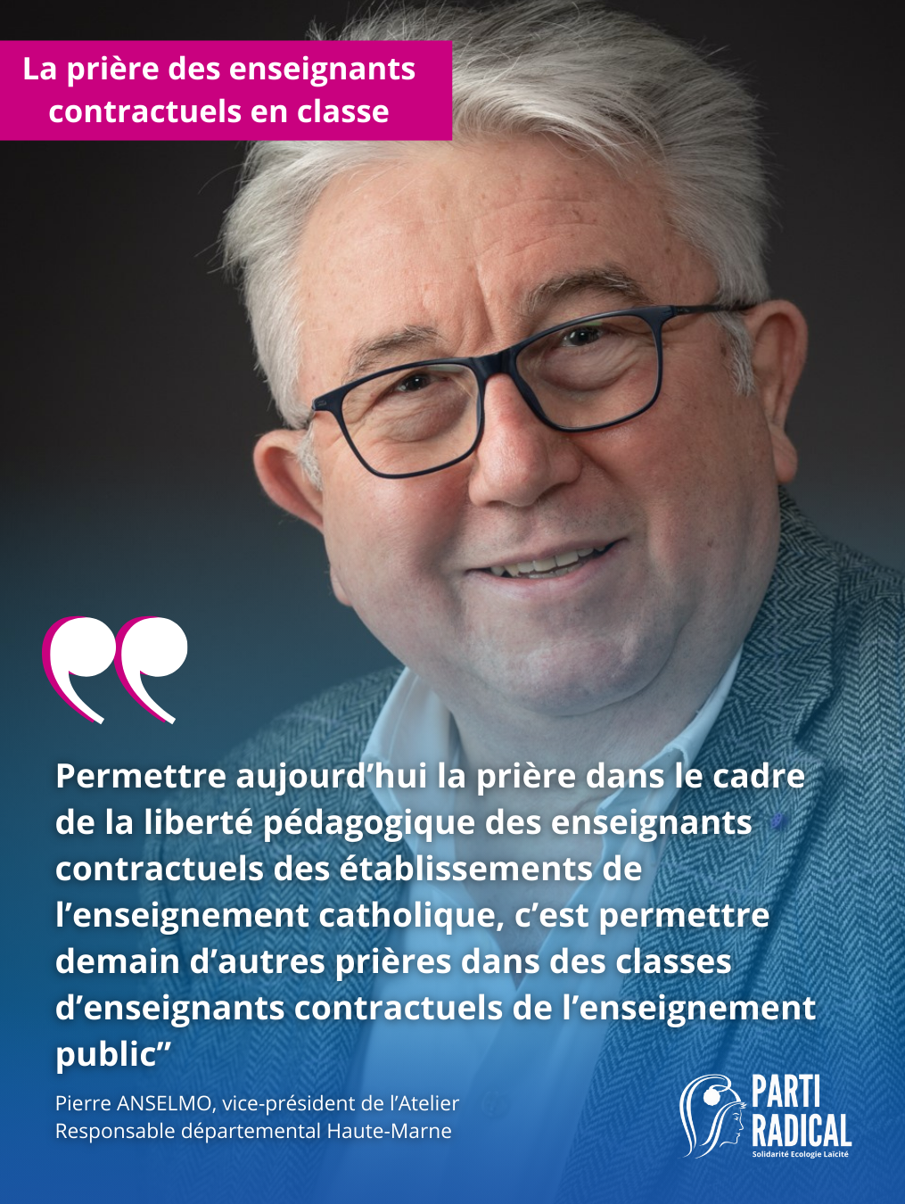 « Dans l’enseignement public comme dans l’enseignement sous contrat, les activités cultuelles doivent être facultatives et se tenir en dehors des temps d’enseignement », précise Pierre ANSELMO, vice-président de l’Atelier, laboratoire d’idées du Parti Radical.