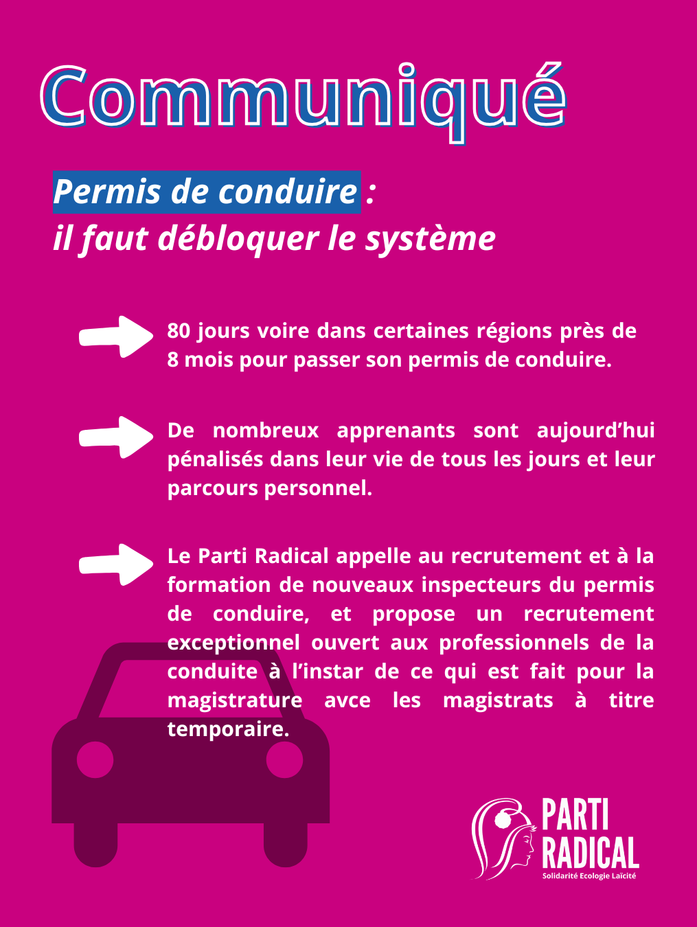 « Nous pouvons saluer le plan d’action annoncé cet été par le Gouvernement prévoyant de créer 80 000 places au permis, toutefois les délais d’attente restent beaucoup trop importants. De nombreux apprenants sont aujourd’hui pénalisés dans leur vie de tous les jours et leur parcours personnel. Parallèlement, on commence à voir se développer des comportements à risque, de plus en plus de personnes conduisant sans permis. Le Parti Radical soutient l’action des auto-écoles qui se mobilisent pour demander le recrutement de nouveaux inspecteurs du permis de conduire. Au-delà du concours ouvrant à cette profession, nous appelons à un recrutement exceptionnel d’inspecteurs ouvert aux professionnels de la conduite à l’instar de ce qui est fait pour la magistrature avec les magistrats à titre temporaire », propose Véronique GUILLOTIN.