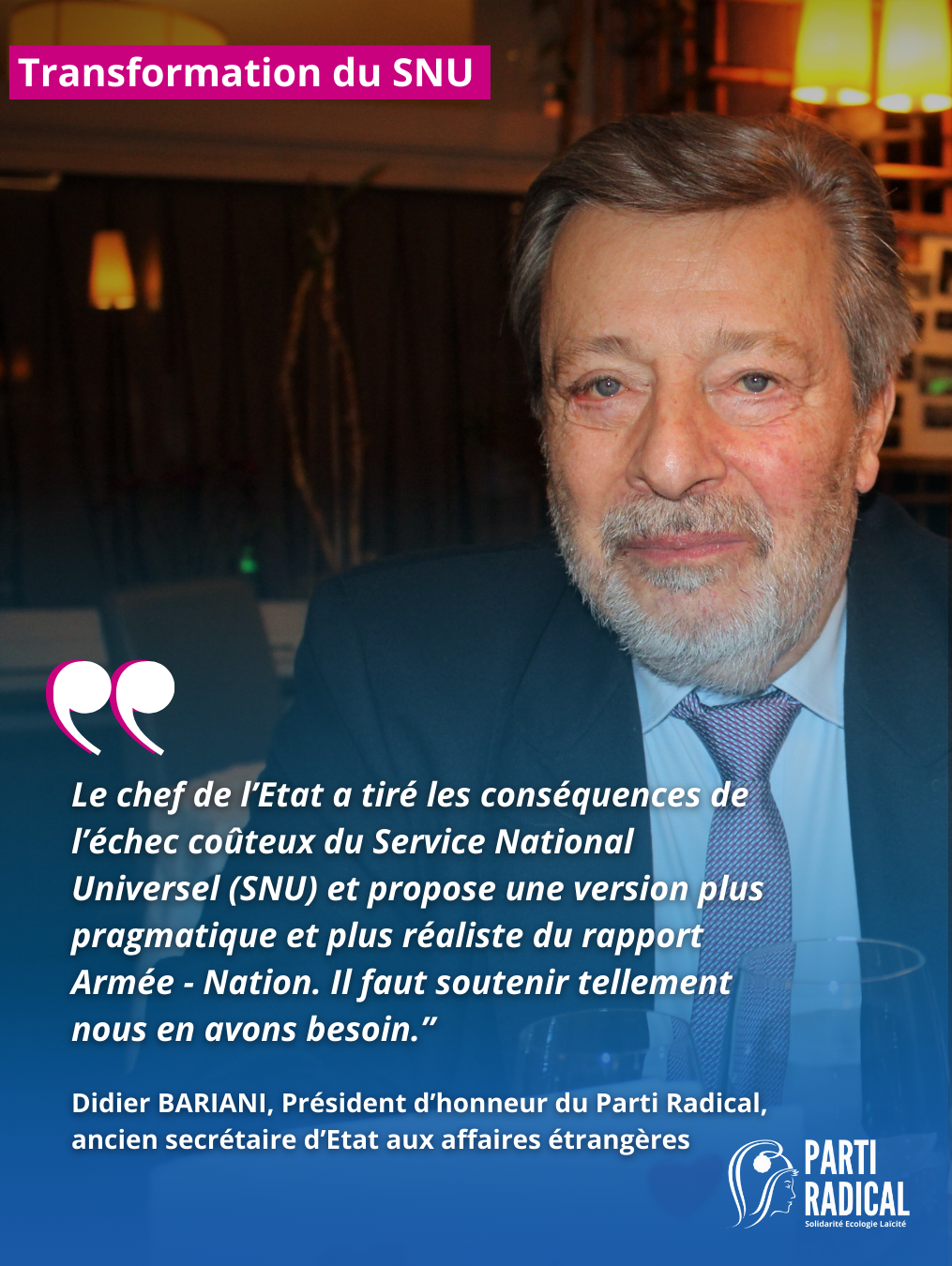 « Mais il faudra bien que ce projet soit initié dès le temps scolaire par un rappel tangible des valeurs de la République et du patriotisme qui devront faire l’objet d’une pédagogie constante » précise Didier BARIANI, Président d’honneur du Parti Radical, ancien Secrétaire d’Etat aux affaires étrangères.