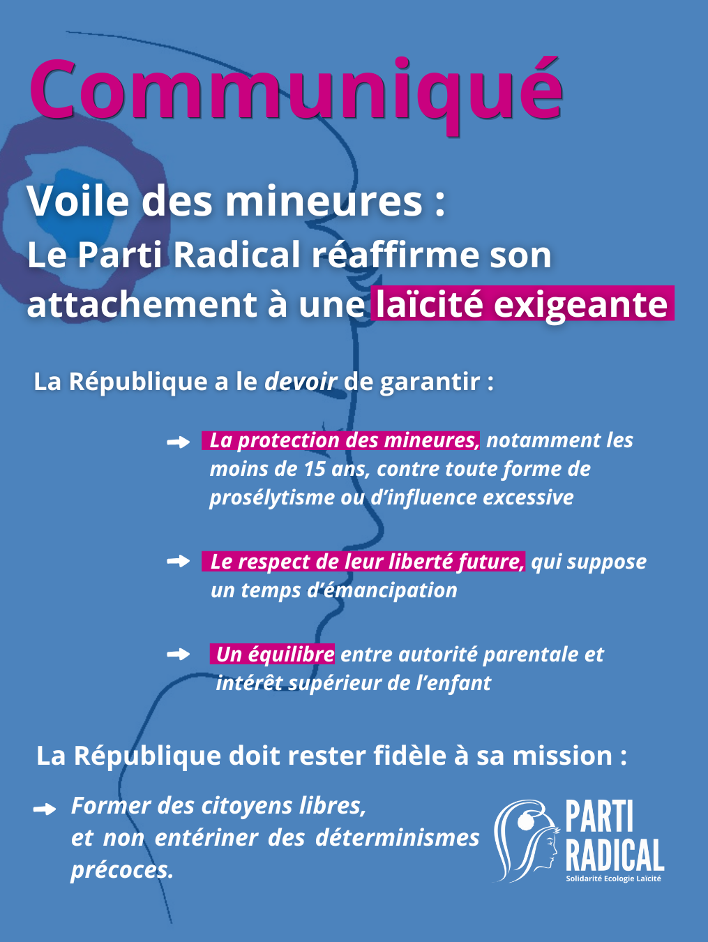 Le Parti Radical réaffirme son attachement à une laïcité exigeante, fondée sur la protection des libertés individuelles, mais aussi sur la protection des mineurs et le respect du rôle éducatif des familles.